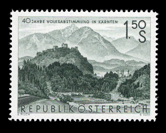 Österreichische Briefmarke "40. Jahrestag der Volksabstimmung in Kärnten" von 1960, 1.50 Schilling, in der Farbe grün, Linienzähnung 13¾, Stichtiefdruck.