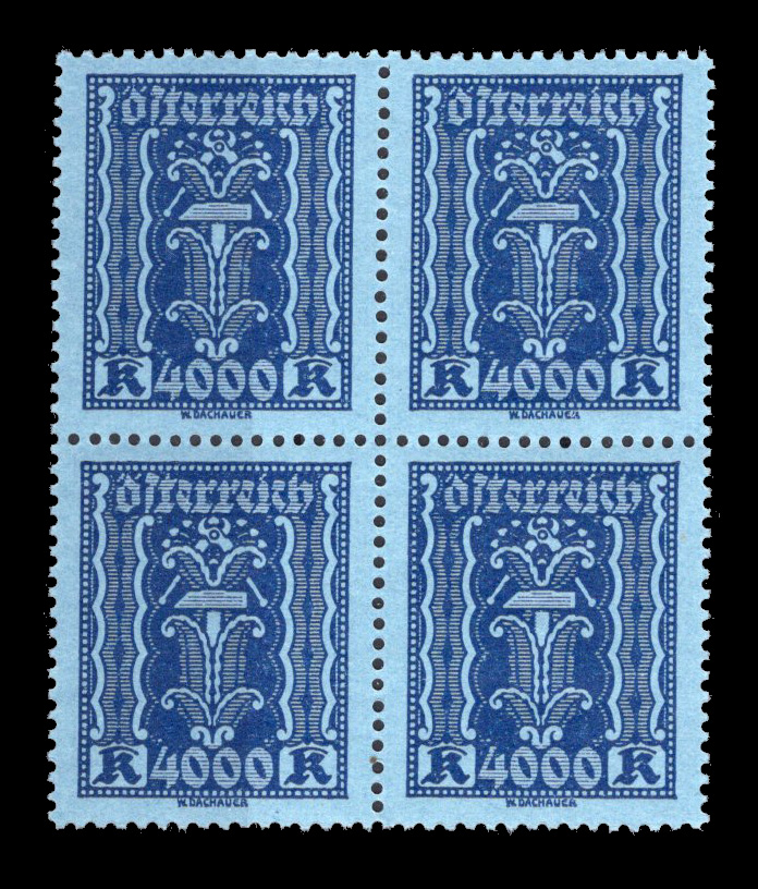 Österreichische Briefmarke "Landwirtschaft, Gewerbe, Industrie" 1922/24, 4000 Kronen als 4er Block, in der Farbe blau auf blau
