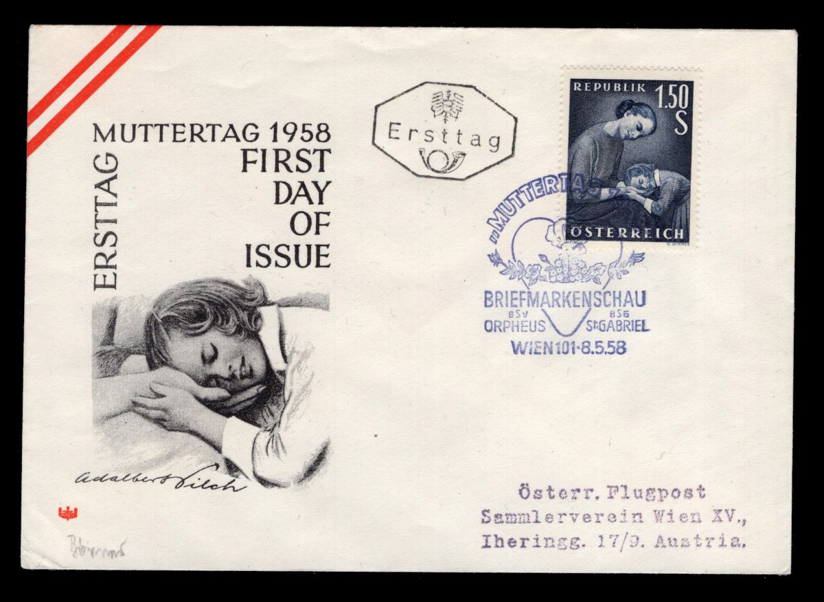 First day cover with the Austrian stamp Michel 1042 "Mother's Day 1958" from 1958 with special cancel "Mother's Day 1958".