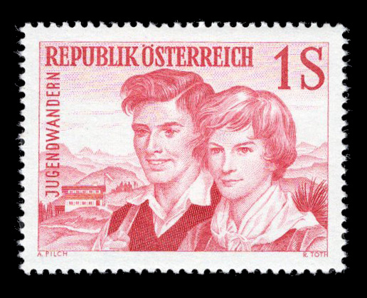 Austrian stamp "Youth hiking" from 1960, 1 Schilling, in the colour dark carmine, comb perforation 14¼ : 13¾, intaglio printing.