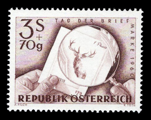 Austrian stamp "Day of the Stamp 1960", 3 Schilling + 70 Groschen, in the colour lilac brown, comb perforation 14¼ : 13¾, intaglio printing