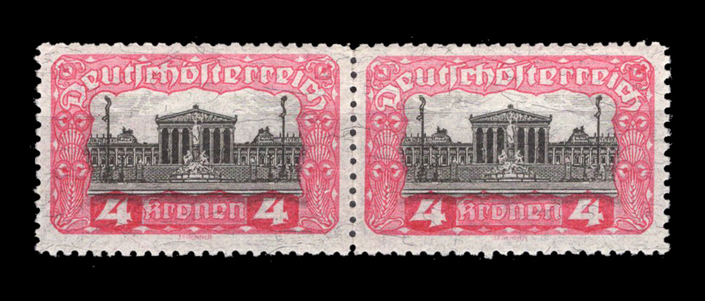 Austrian stamp "Parliament" as a horizontal pair, 4 Kronen, in the colour pink/black, line perforation 12½, intaglio printing on fibre paper.