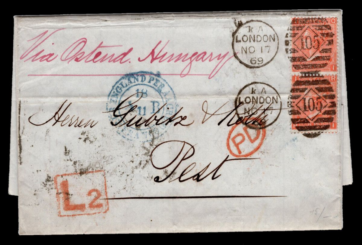 Original image Used cover from London (England, United Kingdom) to Pest (Hungary) on 17. November 1869. Country United Kingdom Year 1869 Tags United Kingdom London Hungary Pest Used cover SKU BKUK-MI24-1-UL € 50,00